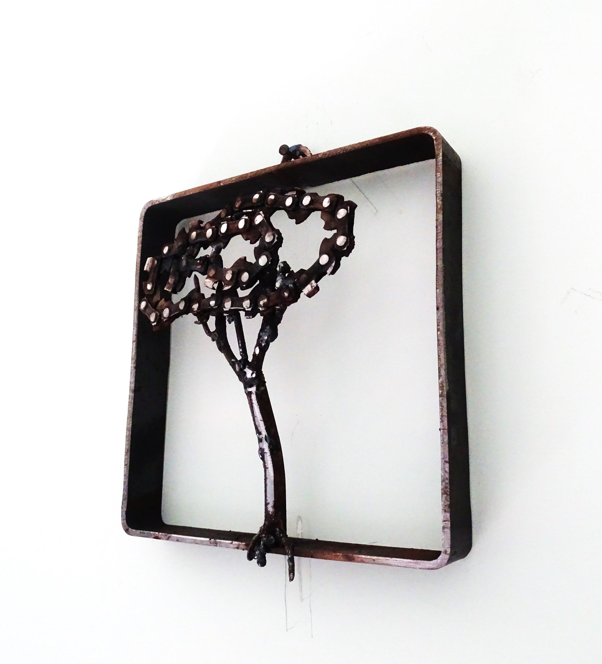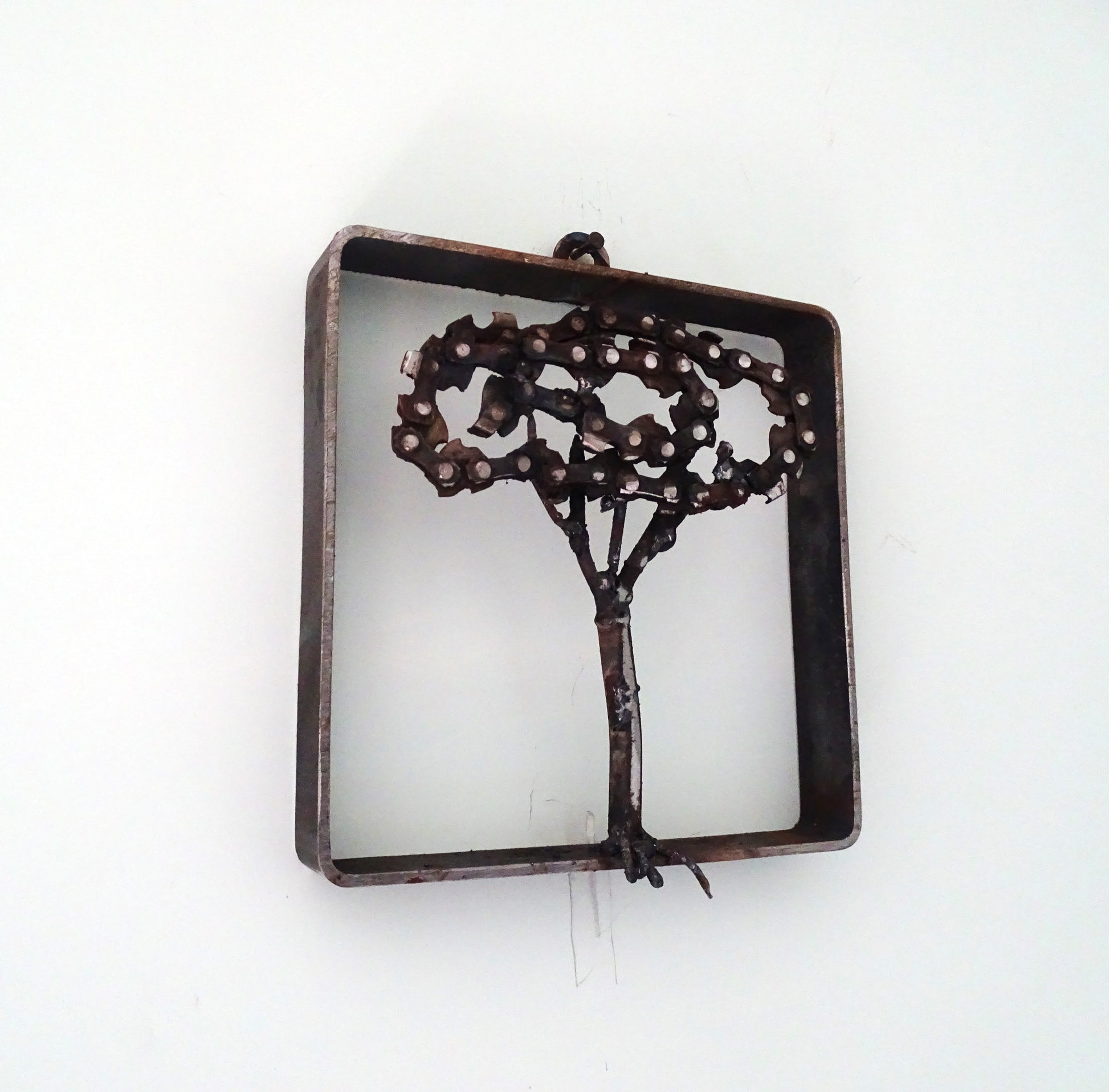 la chioma dell'albero è realizzata con la catena della motosega, il tronco e i rami con pezzi di tondino di ferro, il telaio è una parte di un tubolare.